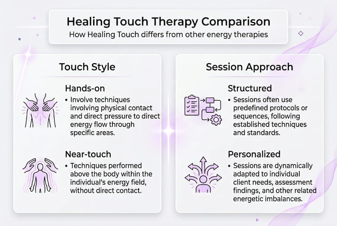 Healing Touch is more hands-on and structured than both alternatives, while Reiki involves less verbal interaction and Therapeutic Touch is primarily a no-contact modality.